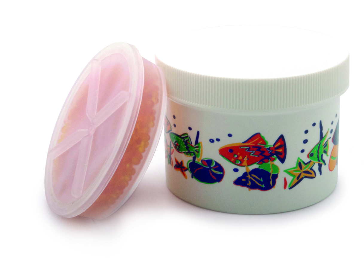 Hearing aid dehumidifier jar with brightly colored tropical fish graphic, large enough for 2 traditional hearing aids.
